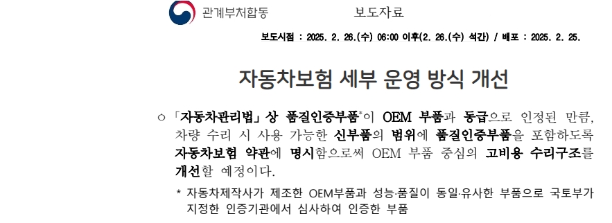 ◦경미손상 수리기준에 따라 교환수리가 불가능해 야기되었던 분쟁이 감소하고, 새 품질인증부품으로 교환 수리가 가능해져 소비자의 만족도가 증가할 것으로 기대